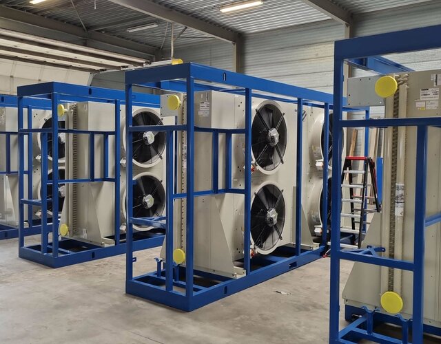 Unsere Trockenkühler (Dry Cooler) sind speziell für die Vermietung in einer stabilen und korrosionsbeständigen Ausführung für die Innen- und Außenaufstellung mit zuverlässigen und leise laufenden Axialventilatoren konzipiert. Kombiniert mit einem optimierten Wärmetauscher sorgt der Miet-Trockenkühler für höchste Effizienzwerte. Der Trockenkühler kann als wassergekühlter Flüssigkeitskühler oder zur direkten Kühlung von Flüssigkeiten mittels Umgebungsluft als Freikühleinheit eingesetzt werden. Bei höheren Temperaturen und für spezielle Materialanforderungen können diese Kühler mit Plattenwärmetauschern zur Systemtrennung kombiniert werden. Bereit für jeden temporären Bedarf.