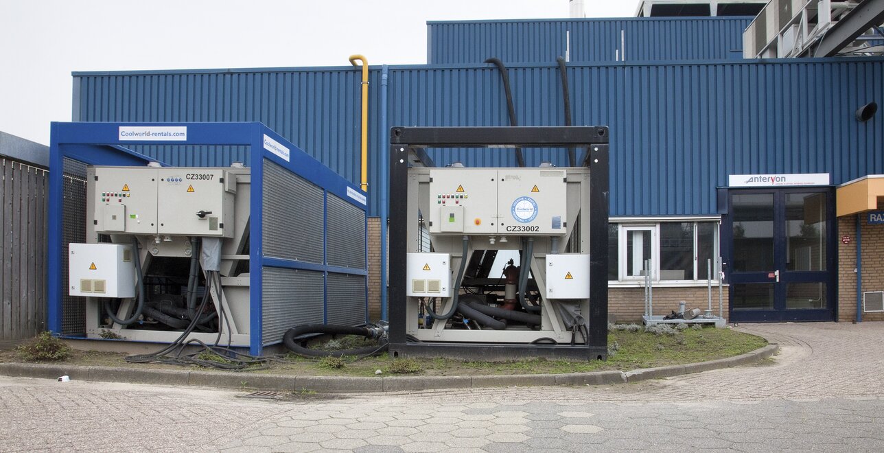 Thanks to its huge rental fleet, even during periods of extreme high temperatures, Coolworld is often able to meet the needs of its clients, from its own depots. Both Anteryon and Coolworld recognise that in an emergency situation, formalities become of secondary importance. Within two hours following the alarm call from Anteryon, the trucks from Coolworld arrived at the Anteryon company location with two heavy-duty chillers, capable of delivering 570 kW of cooling capacity. During the subsequent weekend, Anteryon’s regular installation engineer and technical department joined forces to connect the emergency chiller to the internal cooling system, and to get the system up and running.