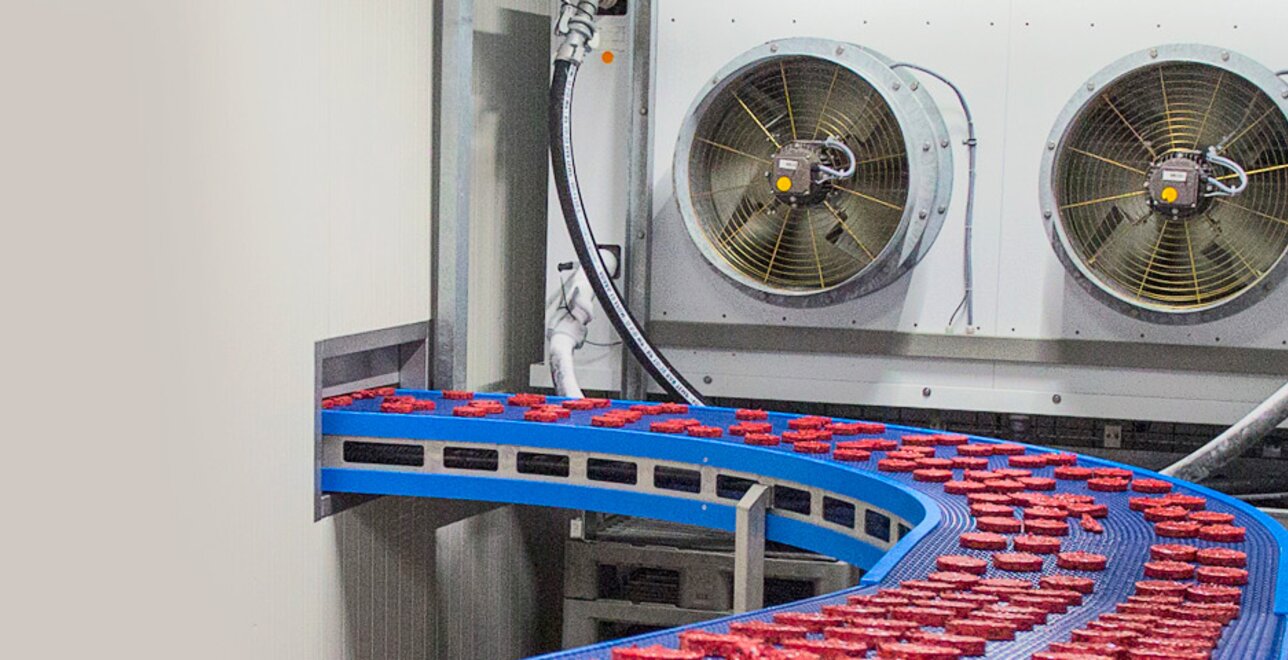 Installation of two type LT02 air handlers with a three-way valve. The air handlers are deployed for the phased cooling of the veggie burgers. The burgers are first cooked and briefly deep-fried. The temperature, which then reaches 80 °C, must be reduced to 60 °C. In this way, excess moisture is extracted. In the next stage, the core of the burger is cooled to just 2 °C. This is a process that must be carried out with absolute precision.