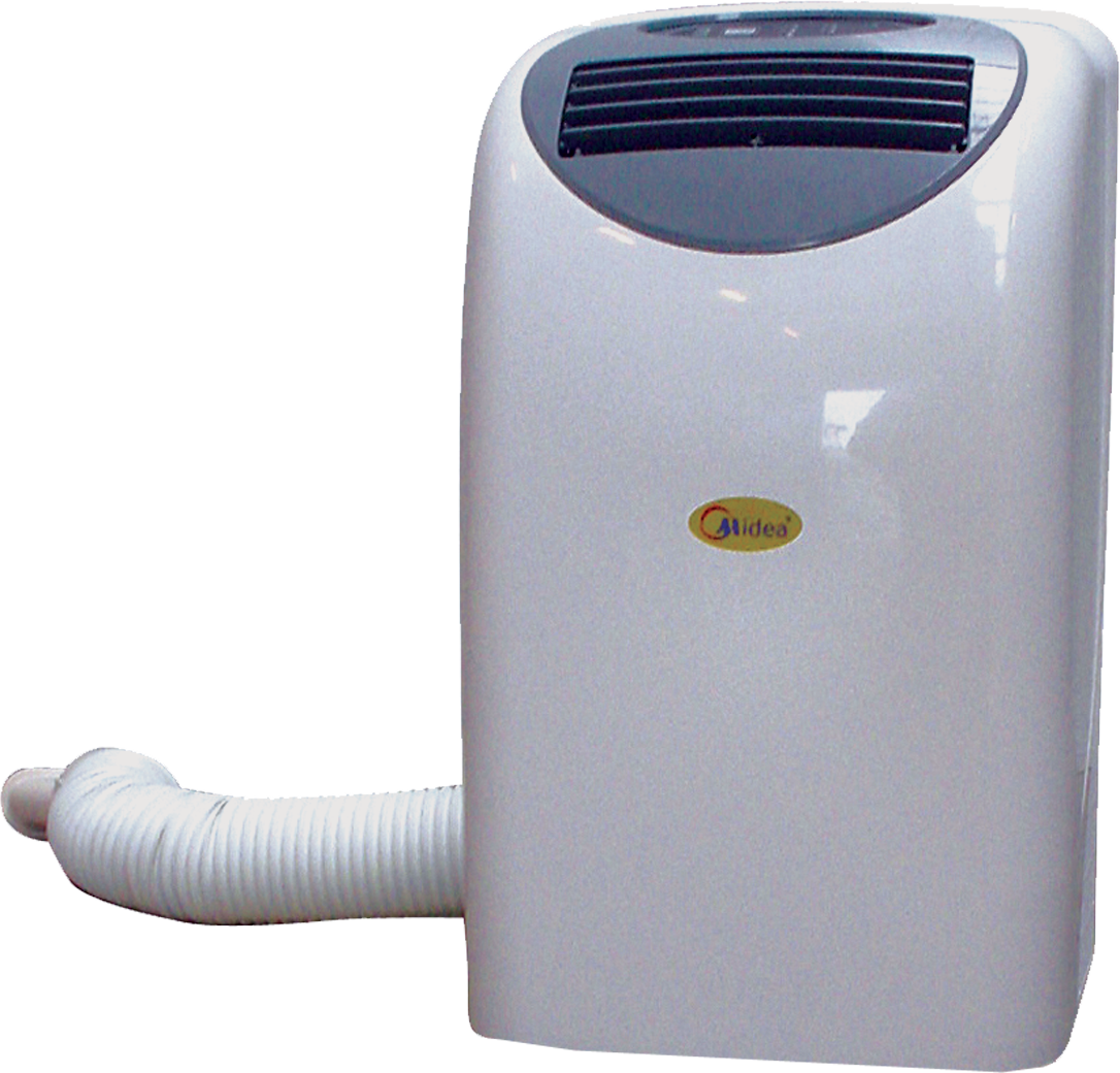Presentable, whisper-silent mobile Midea air conditioner with a 4.1 kW cooling capacity. The unit is ready for use and features a flexible exhaust hose for heat drain and condensation discharge.