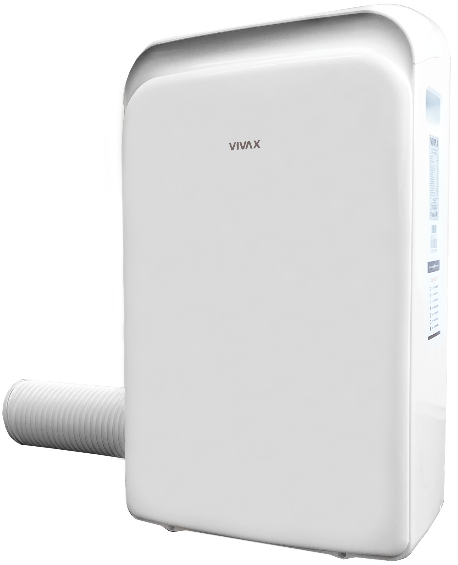 Representative, silent, mobile Vivax air conditioner with a 3.5 kW cooling capacity. This plug & play unit features a flexible exhaust hose to discharge the hot air.