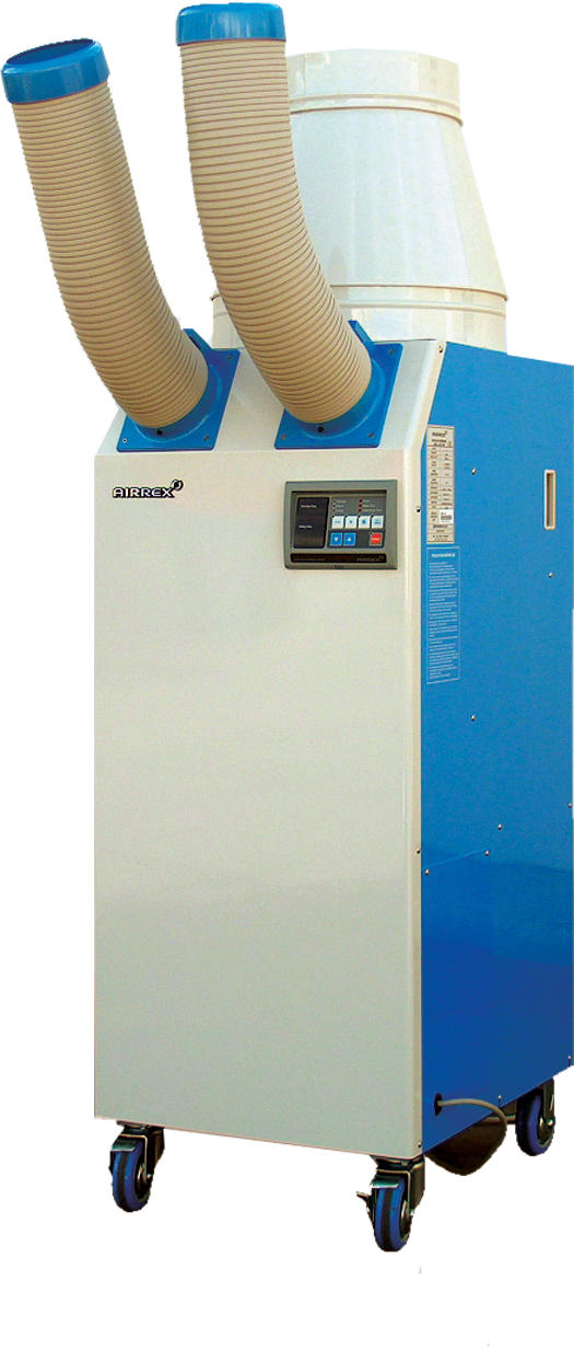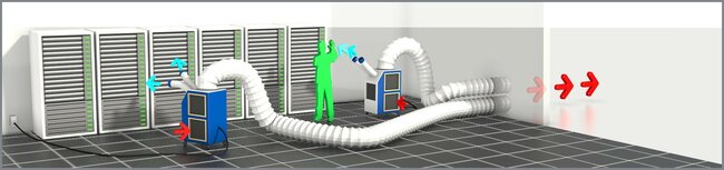 Robust, mobile spot cooler with a 6.2 kW cooling capacity. The unit features two flexible directable exhaust hoses and a high-performance fan, enabling high air output on both the evaporator and the condenser side. The unit is ideal for direct spot cooling in larger rooms and for cooling server rooms.
