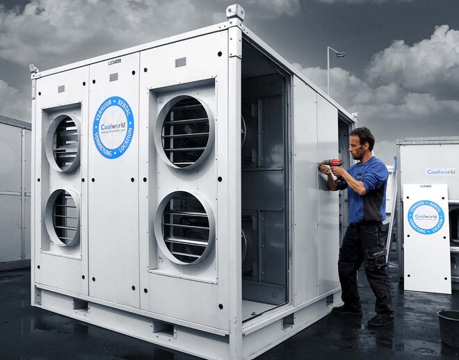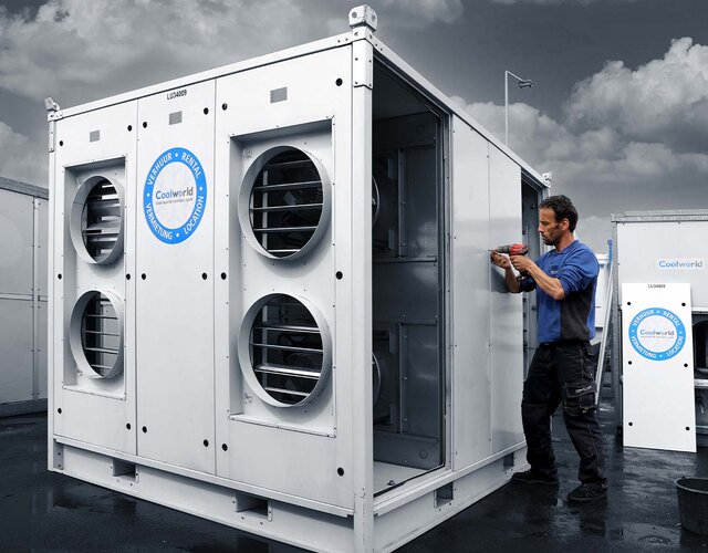Coolworld rents out small office-based air-cons from 2 kW to large air-handling units with an air-cooling capacity of up to 200 kW including all necessary peripheral equipment, such as distribution and discharge hoses, cables and generators.