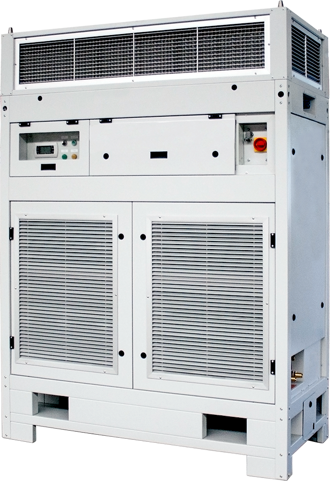 Low-noise water-cooled ventilation unit with a 50 kW cooling capacity, fitted with continuously variable ventilation control that can blow in three directions.The unit is equipped with an additional defrost. As a result, this is also suitable for low-temperature applications, and is also usable as a heater. The unit is equipped with a condensate pump, ready for connection and easy to install by using shortcuts. The unit is easy to move with a pallet cart or forklift.