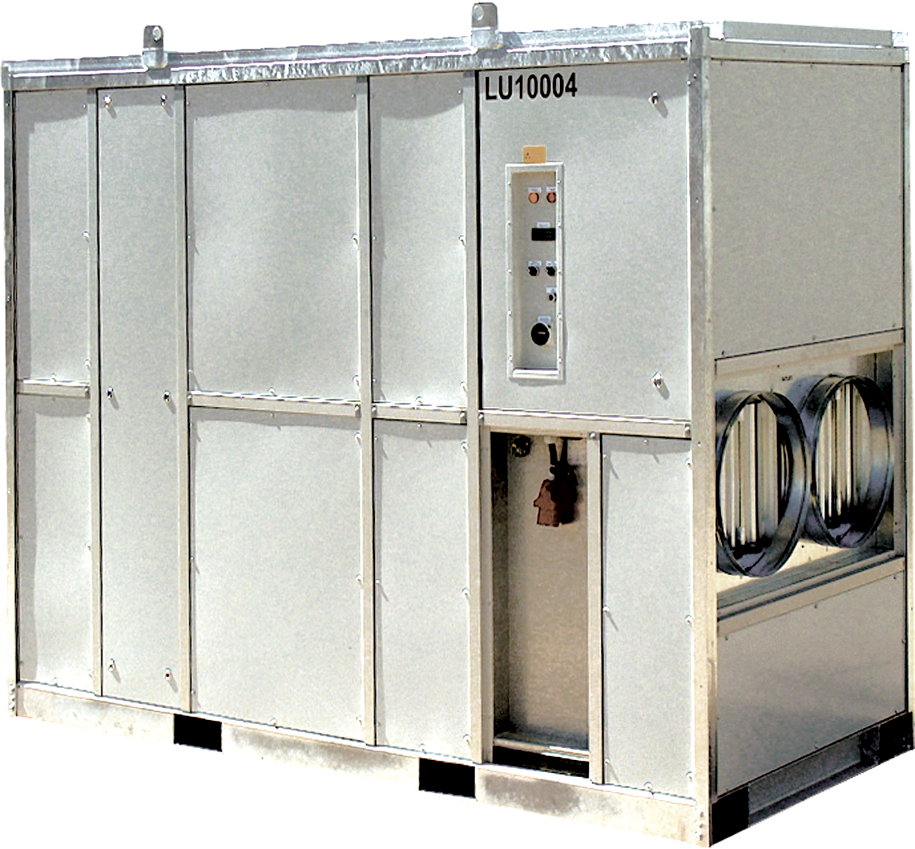 Low-noise water-cooled ventilation unit with a 100 kW cooling capacity, fitted with a heavy-duty fan that produces strong air output. The unit is ready for use and easy to install with its quick-connectors. The machine can be moved easily with a forklift or crane.