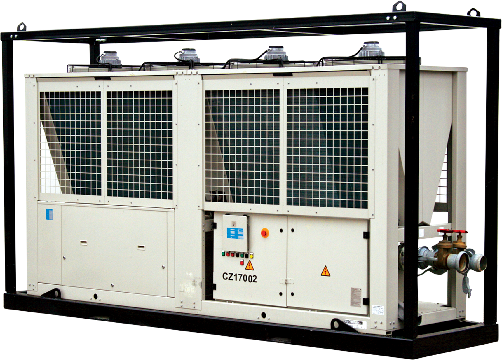 Air-cooled chiller with 240 kW cooling capacity, complete with internal water pump and buffer tank. This low-energy low-noise machine is ready for use. The machine is mounted in a robust frame with a shock-resistant grid for condenser protection and can be moved easily with a forklift or crane.