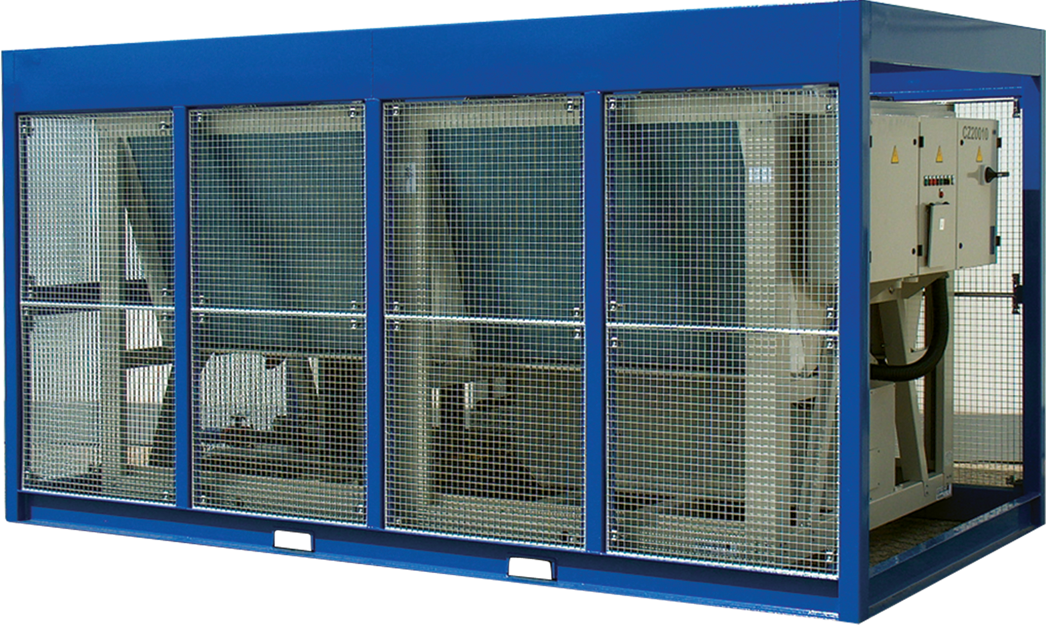 Air-cooled chiller with 200 kW cooling capacity. This low-energy low-noise machine is ready for use. The machine is mounted in a robust frame with a shock-resistant grid for condenser protection and can be moved easily with a forklift or crane.