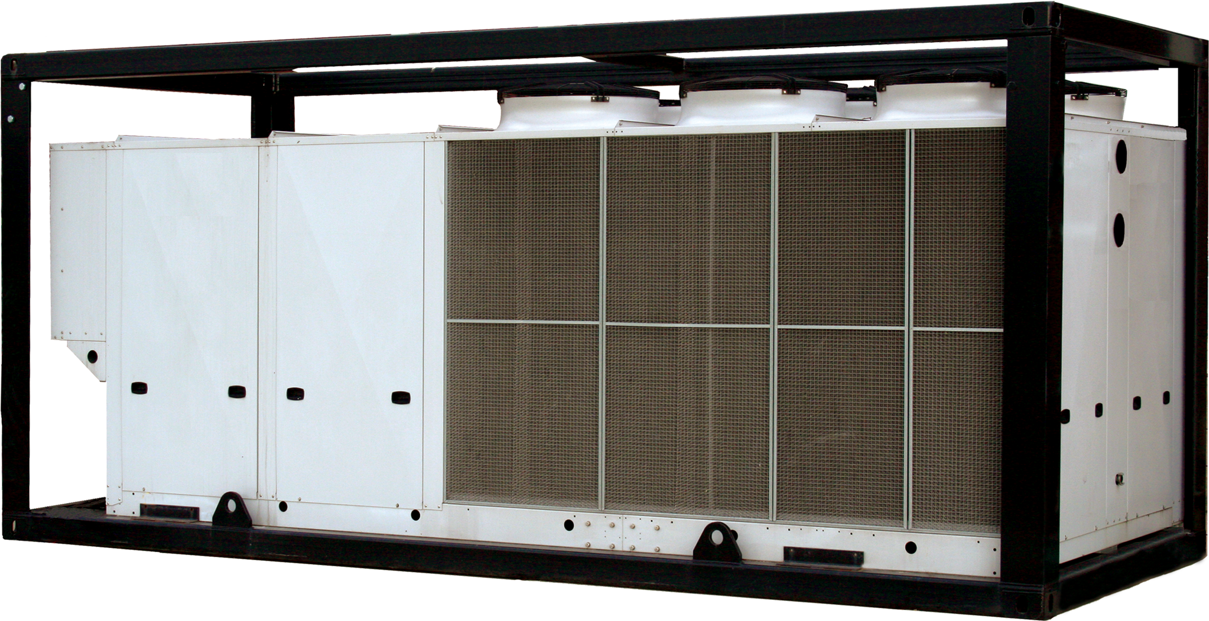 Air-cooled low temperature chiller with 300 kW cooling capacity. This low-energy low-noise machine is ready for use. The low temp chiller is mounted in a robust frame with a shock-resistant grid for condenser protection and can be moved easily with a forklift or crane.