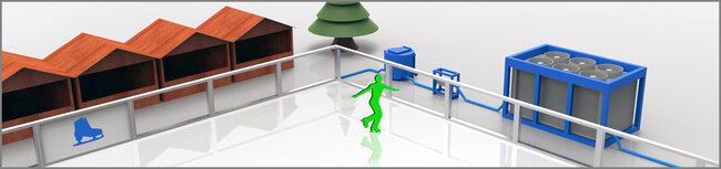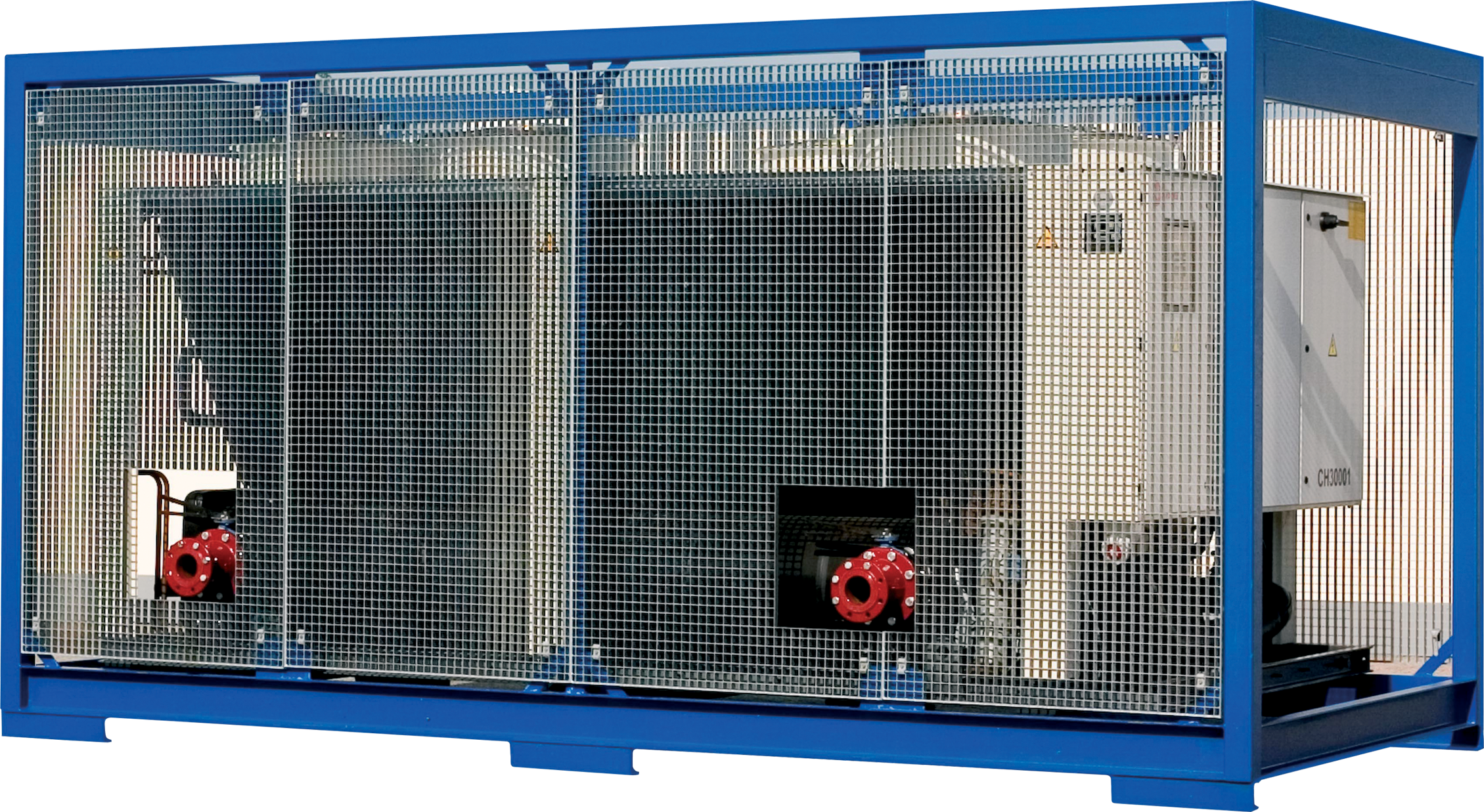 Air-cooled chiller with 500 kW cooling capacity. This low-energy low-noise machine is ready for use. The machine is mounted in a robust frame with a shock-resistant grid for condenser protection and can be moved easily with a forklift or crane.