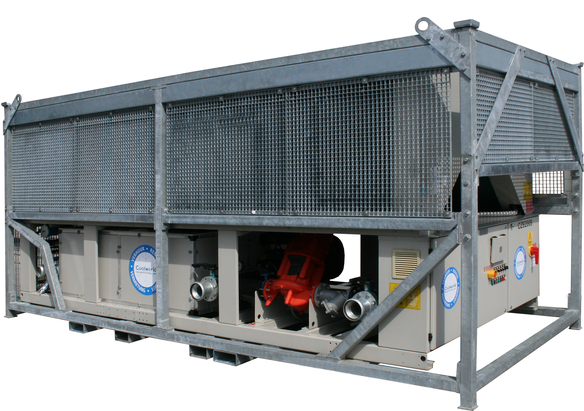 Air-cooled chiller with 615 kW cooling capacity. This low-energy chiller is ready for use. The machine is mounted in a robust frame with a shock-resistant grid for condenser protection and can be moved easily with a crane.