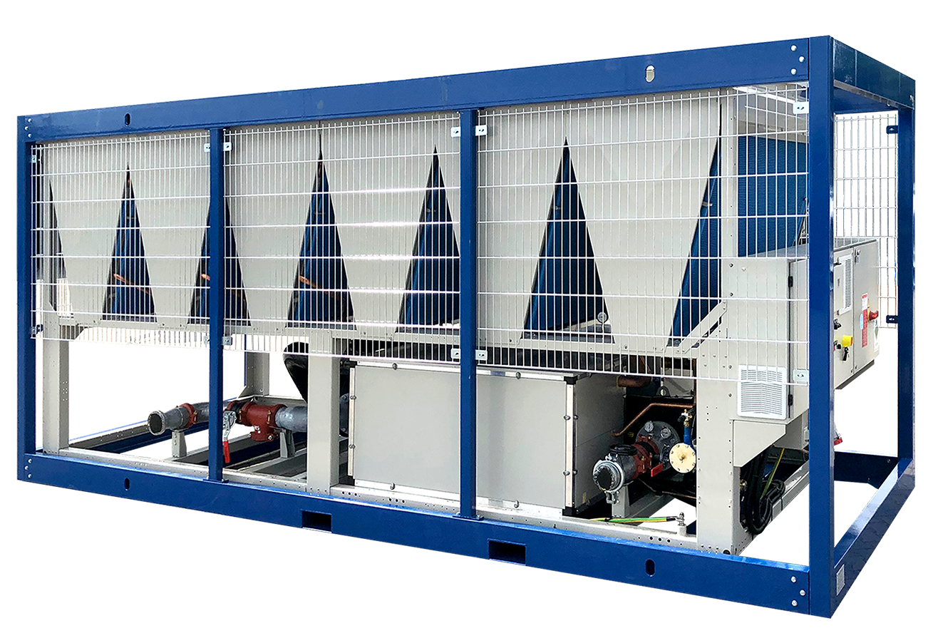 Air-cooled chiller with 610 kW cooling capacity. This low-energy inverter driven chiller is ready for use. The machine is mounted in a robust frame with a shock-resistant grid for condenser protection and can be moved easily with a crane.